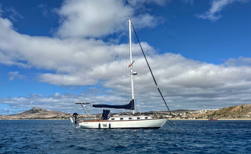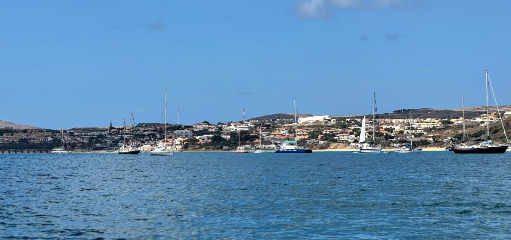 Swan at Anchor at Porto SantoPorto Santo Anchorage in Brilliant SunlightStunning Light Patterns at Porto Santo AnchorageEntrance to Porto Santo MarinaTown Square in Porto SantoTown of Porto Santo Viewed from Main PierPorto Santo with Marina in the DistanceLong Lovely Beach on Porto SantoMain Beach at Porto Santo as Seen from Main PierPorto Santo Town CenterPorto Santo Town Center with Dramatic Peaks in the BackgroundOn an Excursion with My Brompton Folding BikeA View from the Dinghy Back Through the Anchorage with Swan in the DistancePrepping to Top off the Water TanksWater Jugs Lugged by Dinghy from the MarinaWater Jugs Filled at the Marina DockSwan with Two Anchors Deployed Due to Stiff Winds off the Land and Open Ocean off the SternDinghy Dock at the Porto Santo MarinaBeach at Porto Santo Right Next to the MarinaPorto Santo Anchorage Outside the Harbor
